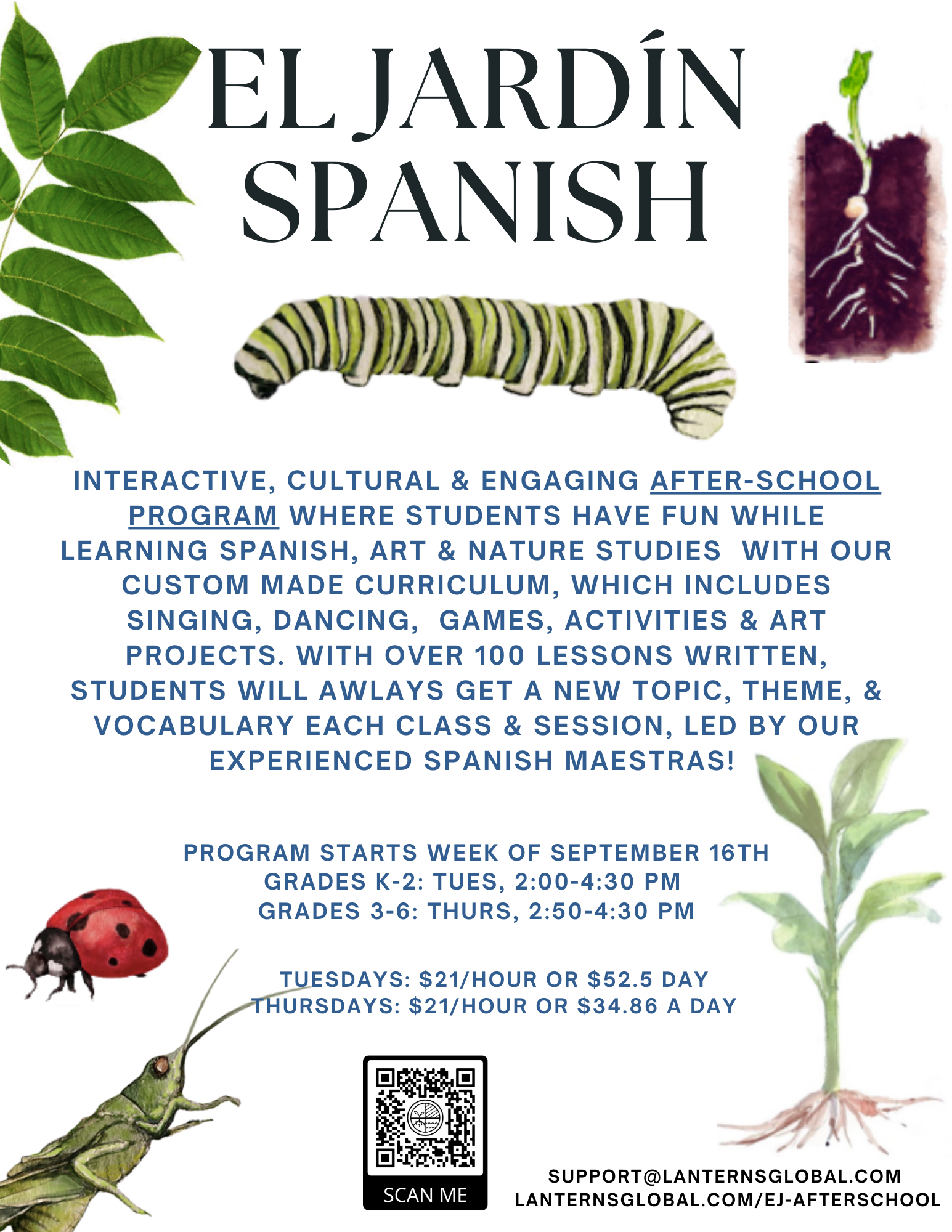 El Jardín is our interactive, cultural, & engaging After School Programs where students have fun while learning Spanish, art & nature studies with our custom made curriculum, which includes singing, dancing, games, activities & art projects. With over 100 lessons written, students will always get a new topic, theme, & vocabulary each class & session, led by our experienced Spanish maestras!